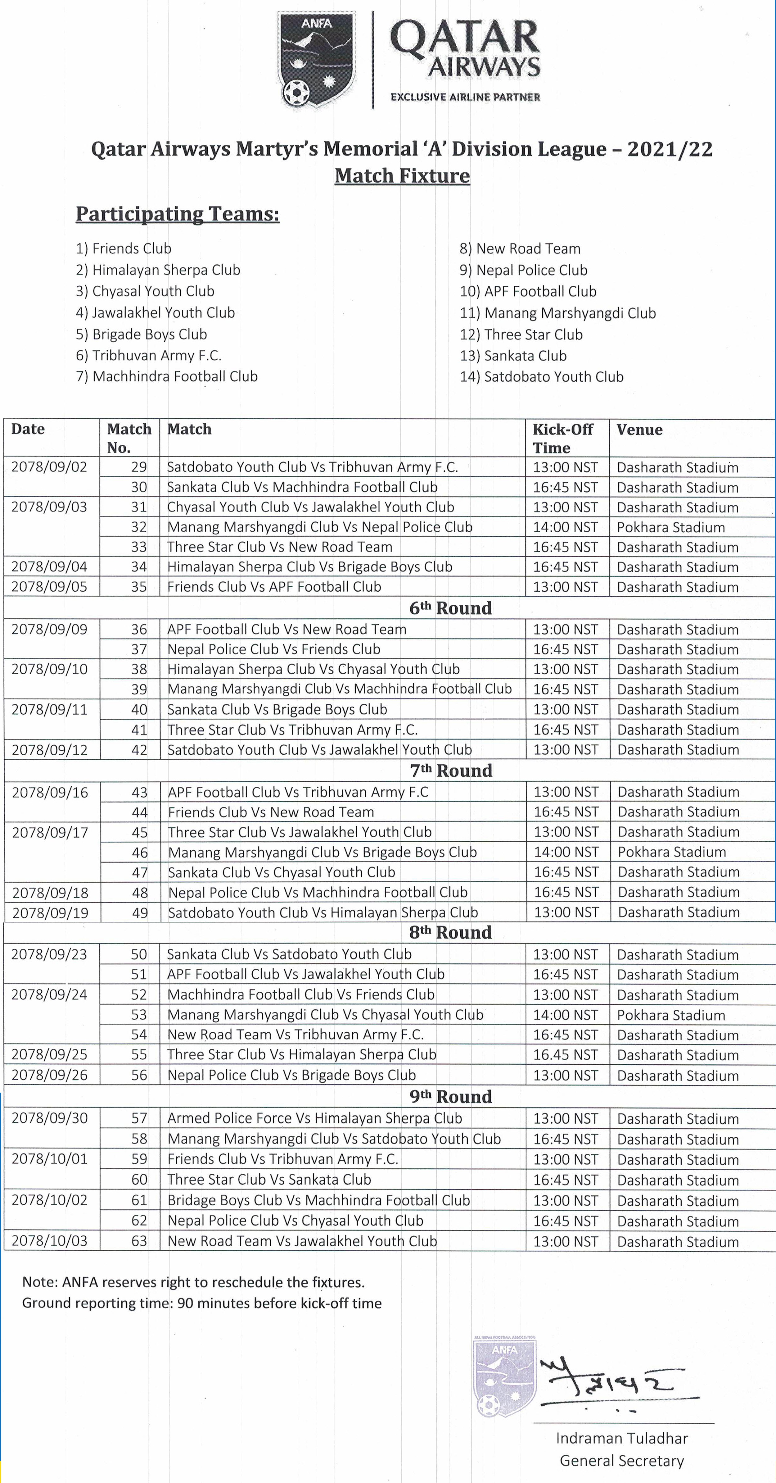With the conclusion of the match, the sixth round of the league also came to an end. Machhindra Football Club are top of the table after their 1-0 triumph over second-placed Manang Marsyangdi Club.