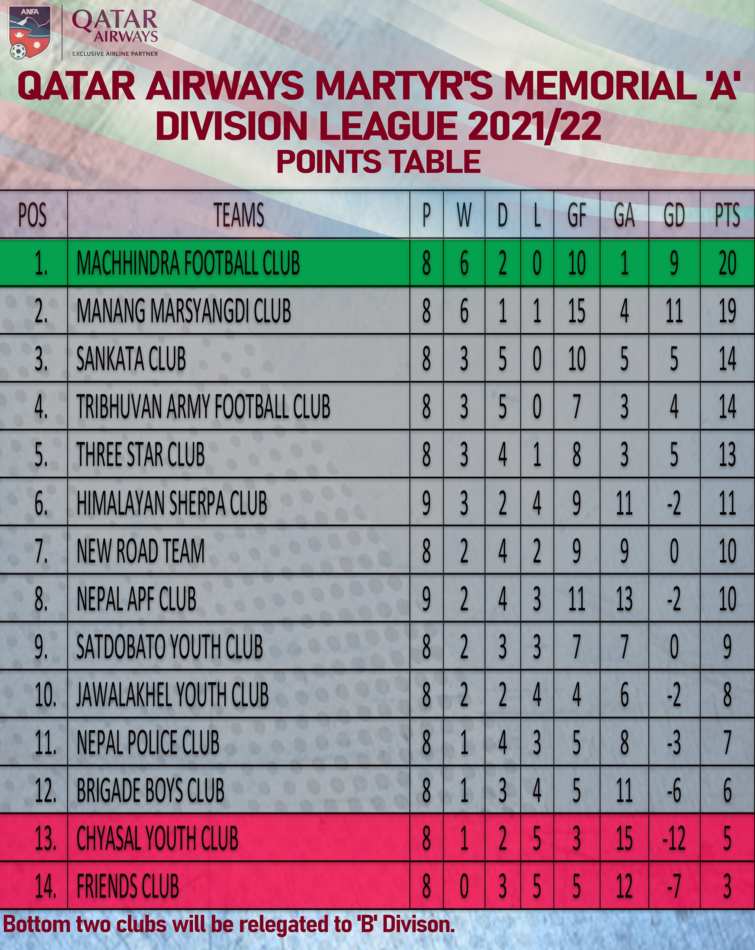 Manang Marsyangdi Club will play against Satdobato Youth Club in the second match today. The match will begin at 4:45 pm in Dasharath Stadium.